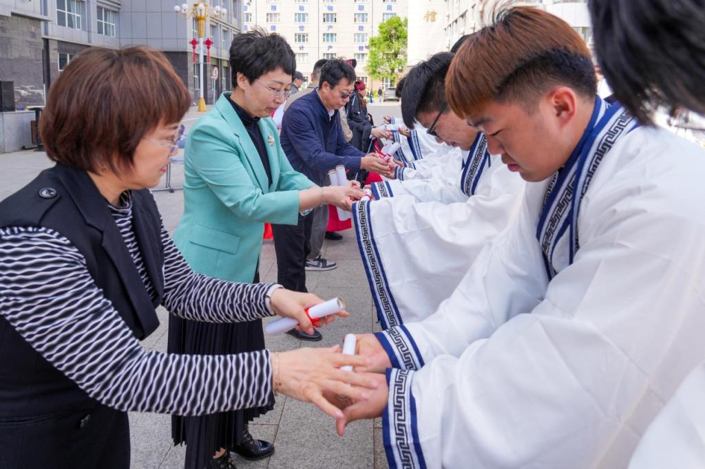 5月15日,学校第五届学生汉服成人礼活动在汉阳校区举行。学校党委书记何晓杰、副校长刘占文、副校长张晓娟及各二级学院党总支书记出席活动。 仪式分为八个部分:迎宾、就位、献花、冠笄礼、宣誓礼、正衣冠、授字和礼成。活动在司仪的吟诵中拉开序幕,充满了中华文化之风的浓厚氛围。由司仪宣布“甲辰年成人礼开始!”在击鼓和鸣钟声中,560名冠笄者有序入场。仪式过程中,师长们为冠笄者加冠加笄,接受成人礼的学生们向师长行礼,一拜一兴之间都流露着加冠笄者对师长、国家的感激与尊敬。最后,在参加冠笄礼青年学生的宣誓词中,结束了这场庄重典雅的成人礼。 本次成人礼活动是弘扬优秀传统文化和社会主义核心价值观系列活动之一,旨在引导青年学生培养心怀感恩、勇于担当、立志报国的优秀品格,成人礼既让学生们感受到了中国传统文化的魅力,更对学生进行了责任教育。 (供稿单位:创新创业与素质教育中心 初审:孟令飞 复审:刘莹 终审:汤海涛)
