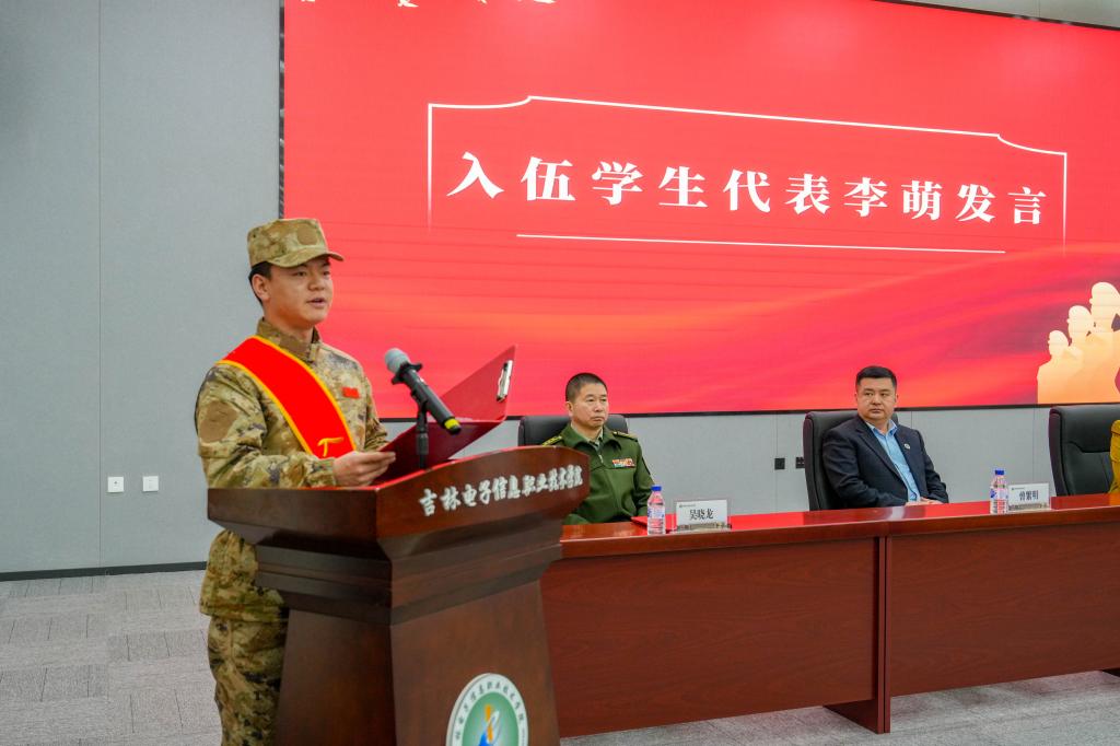 李萌同学作为新兵代表发言,他表达了对母校培养的感谢、对军营生活的向往。他表示,将尽快从一名普通大学生成长为一名优秀军人,不辜负祖国和人民的期望。